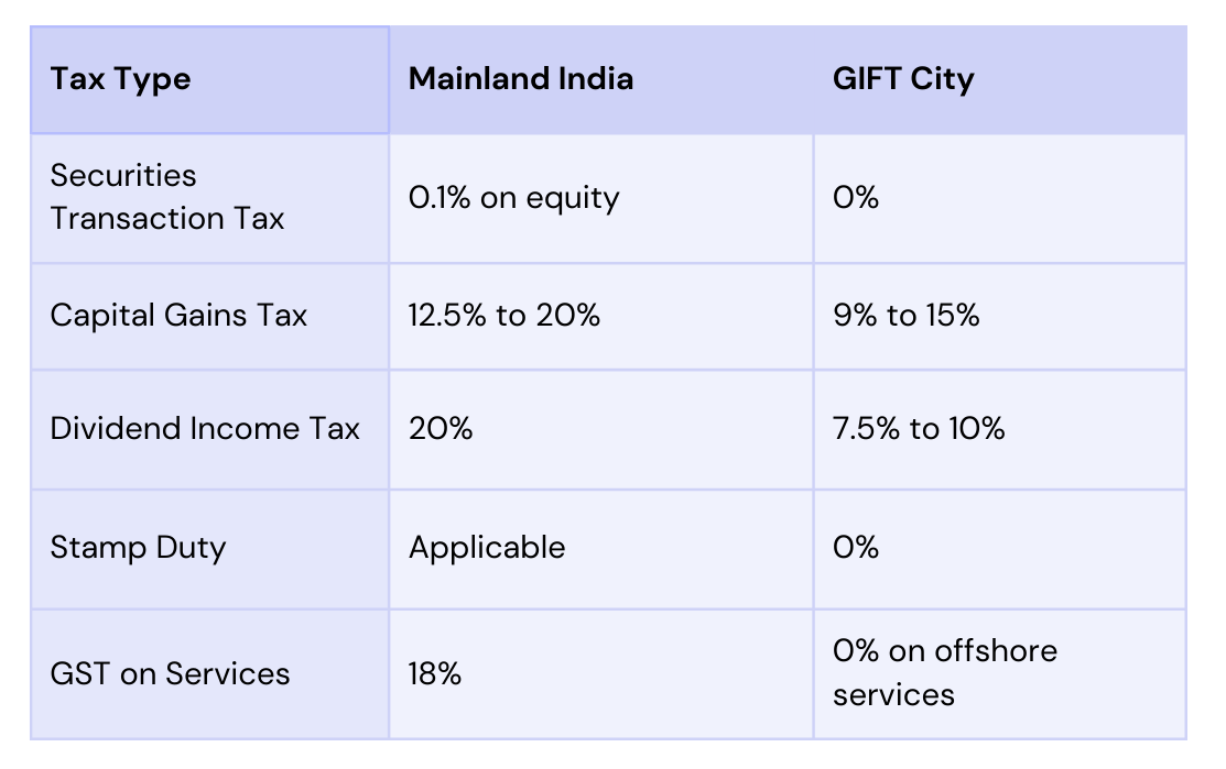 GIFT City's tax structure can save you between 10% to 30% on investment taxes compared to mainland India investments.