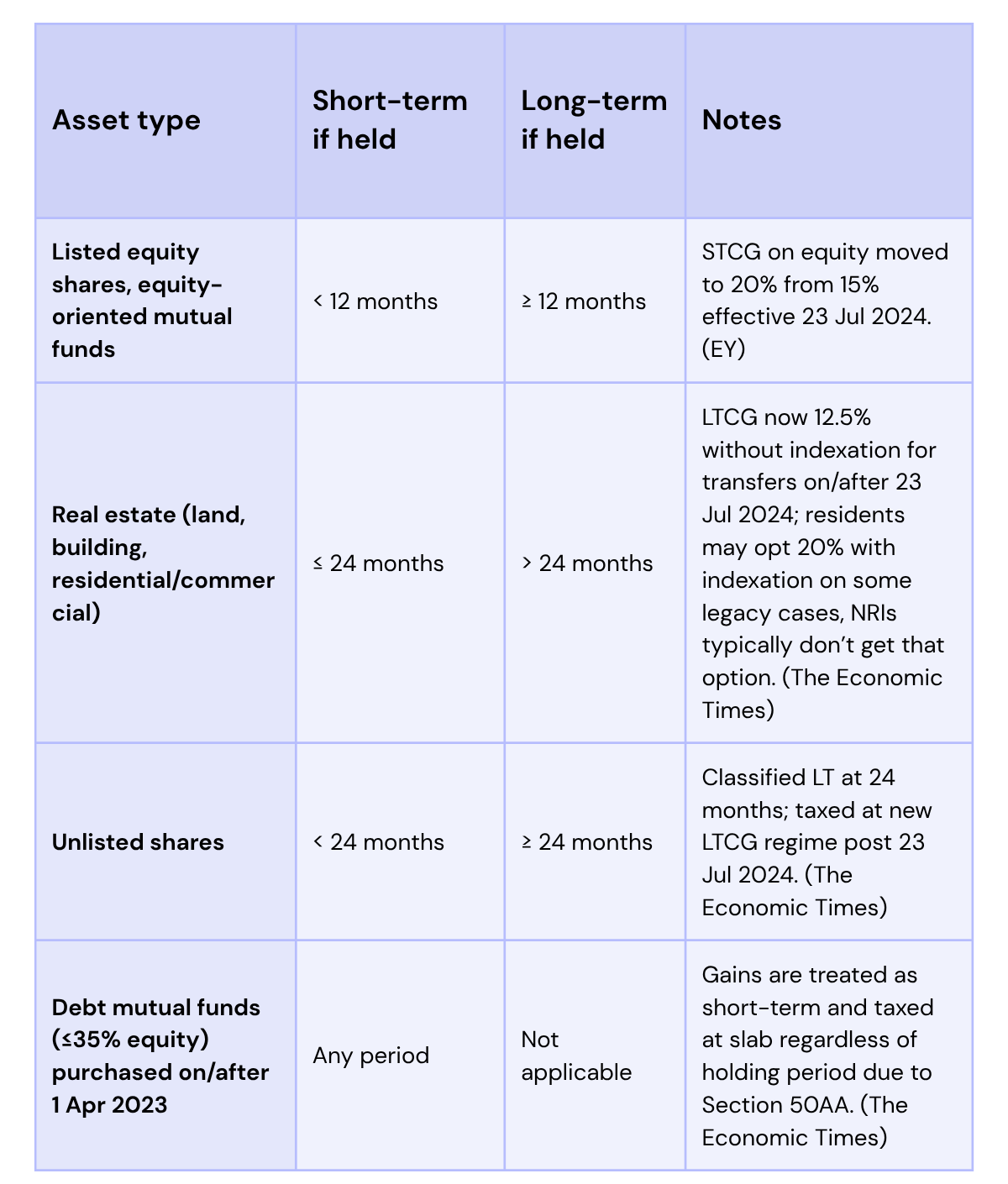 Your tax rate depends first on how long you held the asset. This “holding period” is different by asset class. For NRIs, getting this right unlocks the right capital gain tax for NRI in India rules and TDS treatment.