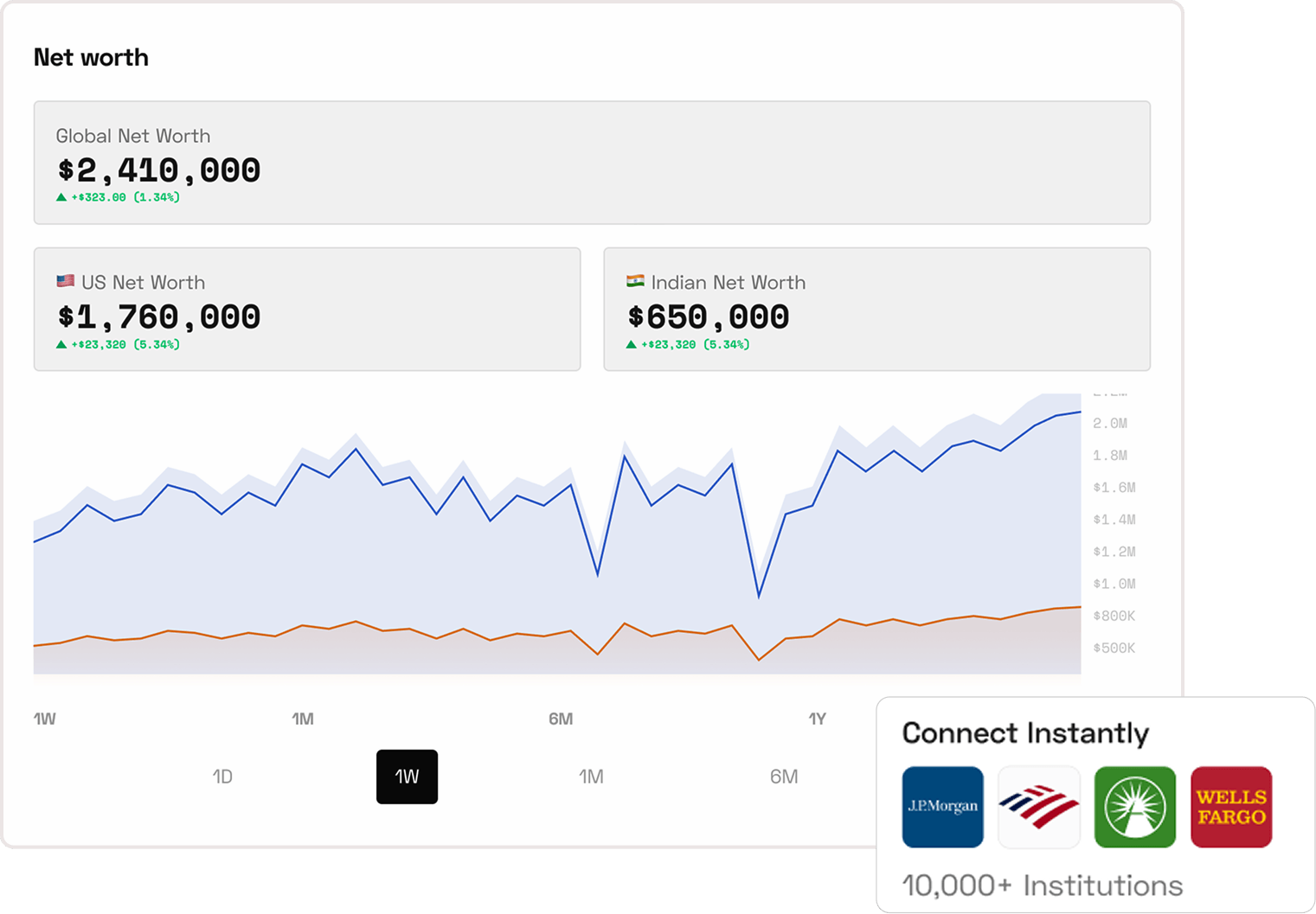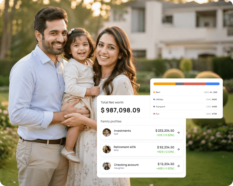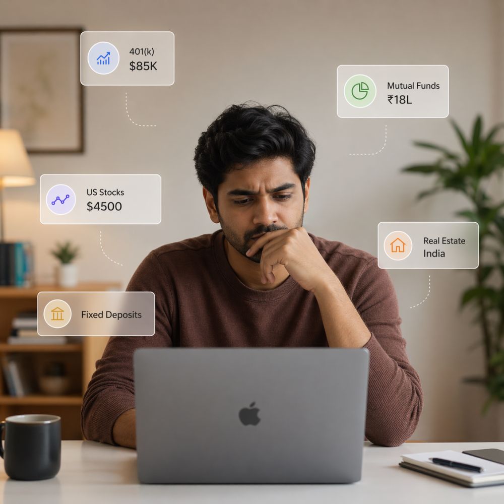 Instead of checking multiple platforms, you can bring all your investments, assets, and accounts into one dashboard. You don't have to calculate or guess your net worth anymore you can see it clearly, across both India and the US.