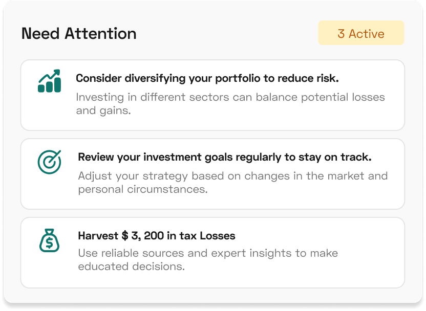 AI spots overexposure, tax risks, and rebalancing opportunities. Advisors are one click away when you want human guidance.